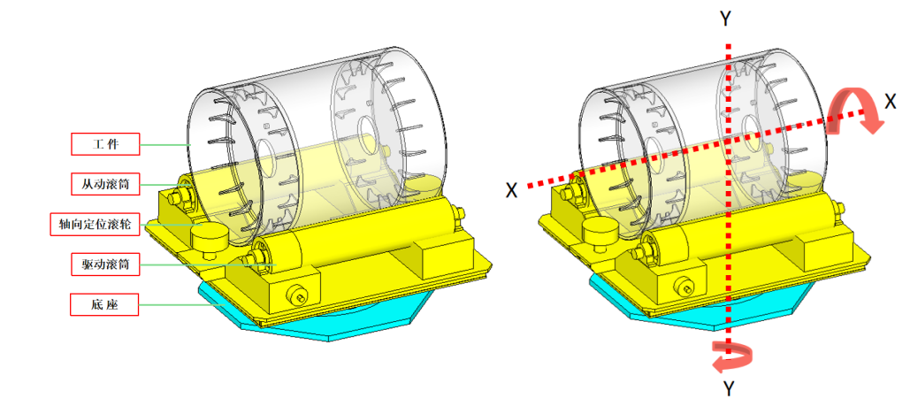 變位機(jī)包含可以使工件繞軸向中心旋轉(zhuǎn)的X軸以及繞變位機(jī)底座中心旋轉(zhuǎn)的Y軸,兩軸均為聯(lián)動伺服電機(jī)控制,其中X軸為雙驅(qū)動。X軸轉(zhuǎn)動范圍為±360°,Y軸轉(zhuǎn)動范圍為±180°。